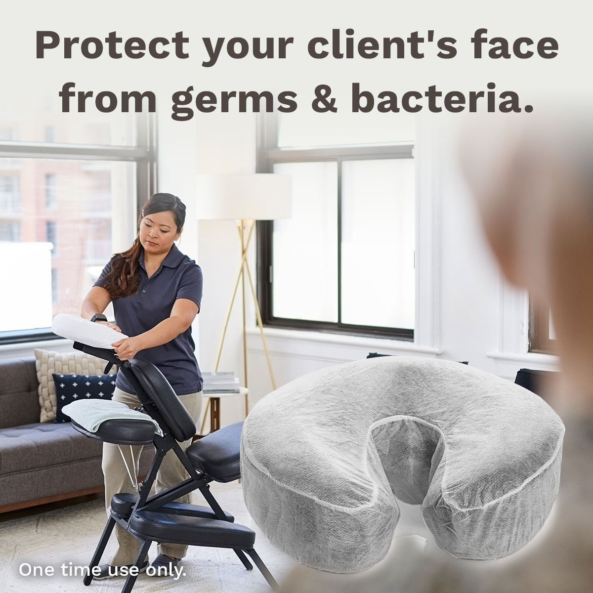 Finally an alternative to the standard flat drape face rest covers, or the nurse's cap styles we all have used. These disposable face rest covers look clean and professional and fit most face rest pads. No need to create a hole. This model has one built in.